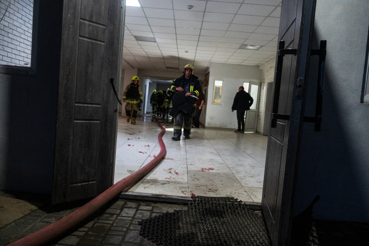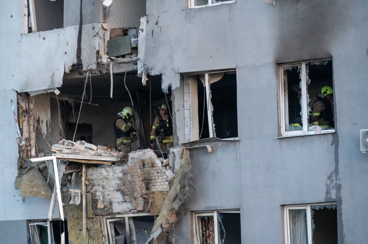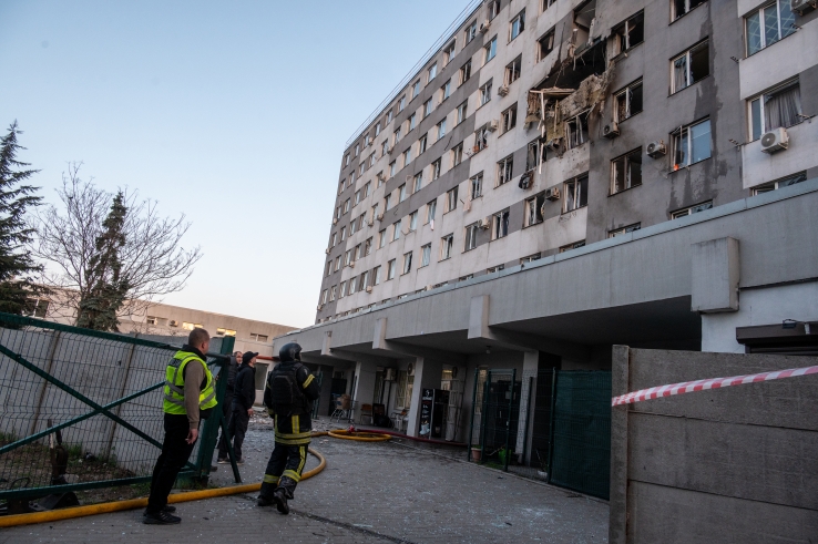 Rescue workers in the lobby of a residential building damaged in a russian strike on Odesa, April 15, 2026
