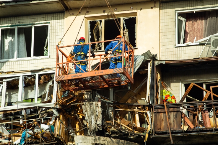 Rescue workers inside a residential building struck in a russian attack in Kyiv’s Desnianskyi district, November 14, 2025