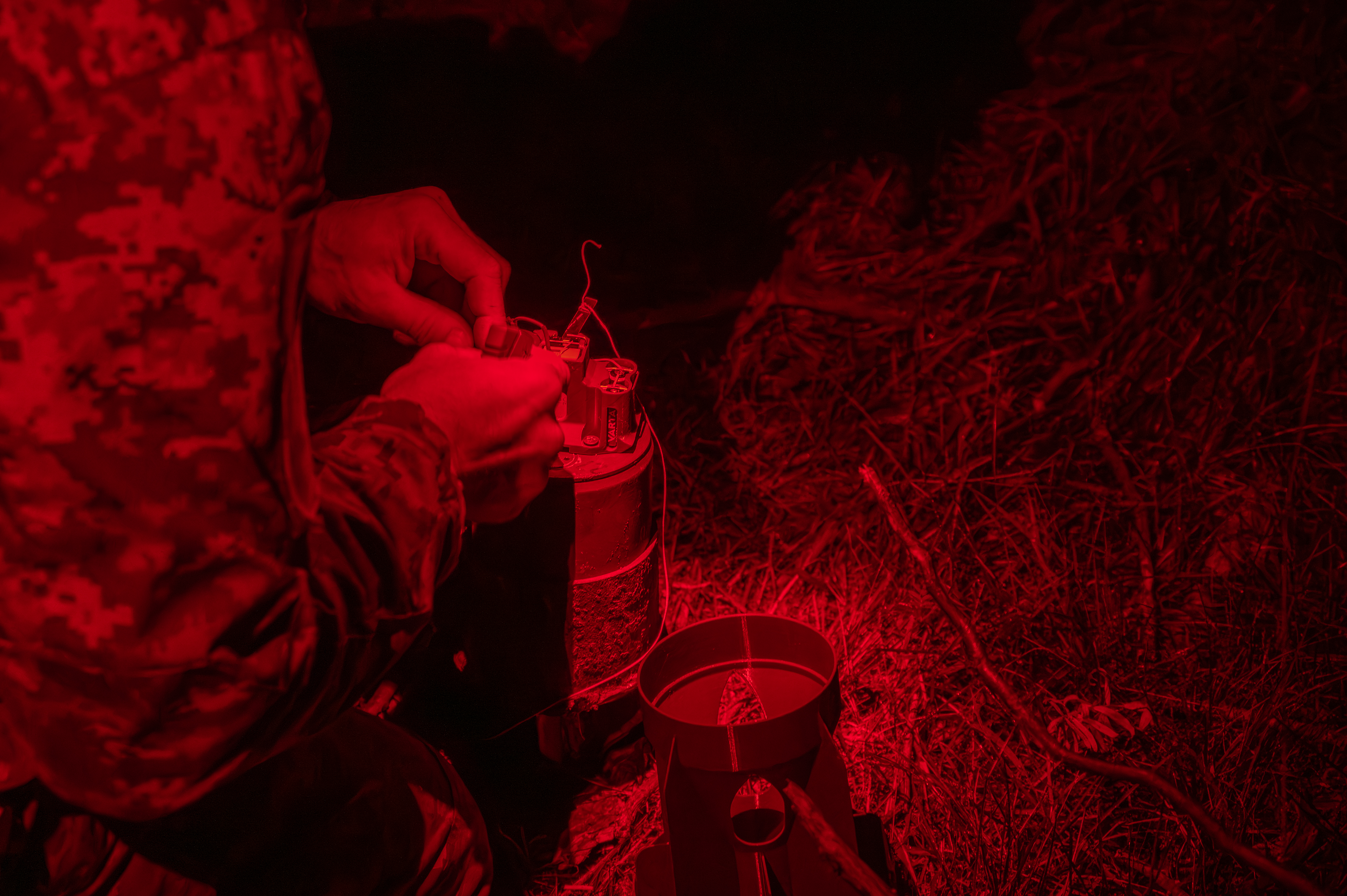 Unmanned remote-controlled naval mines deployed along the Dnipro river bank during a maritime warfare mission in the Kherson region, December 2025