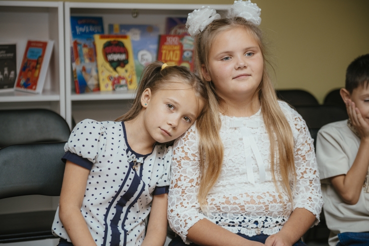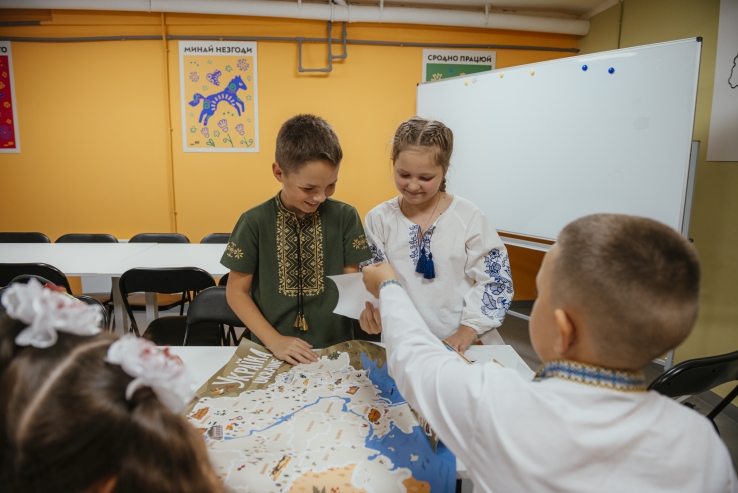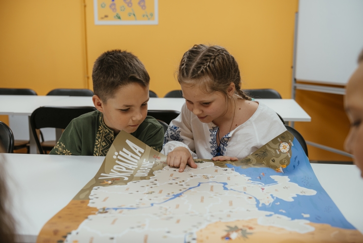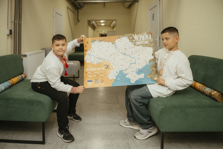 Children in a school bomb shelter set up by the savED Foundation in Balakliia, Kharkiv region, 2025