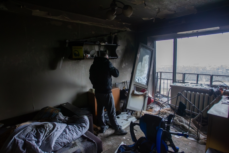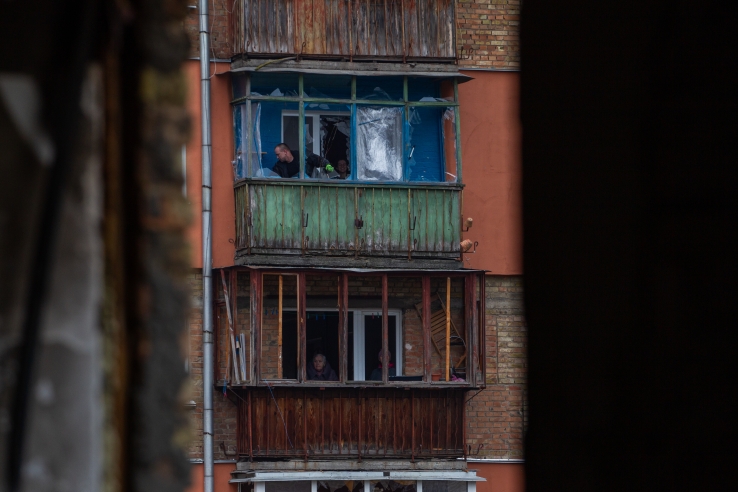 Damage is seen to an apartment building in Kyiv’s Sviatoshynskyi district hit by shelling, November 29, 2025