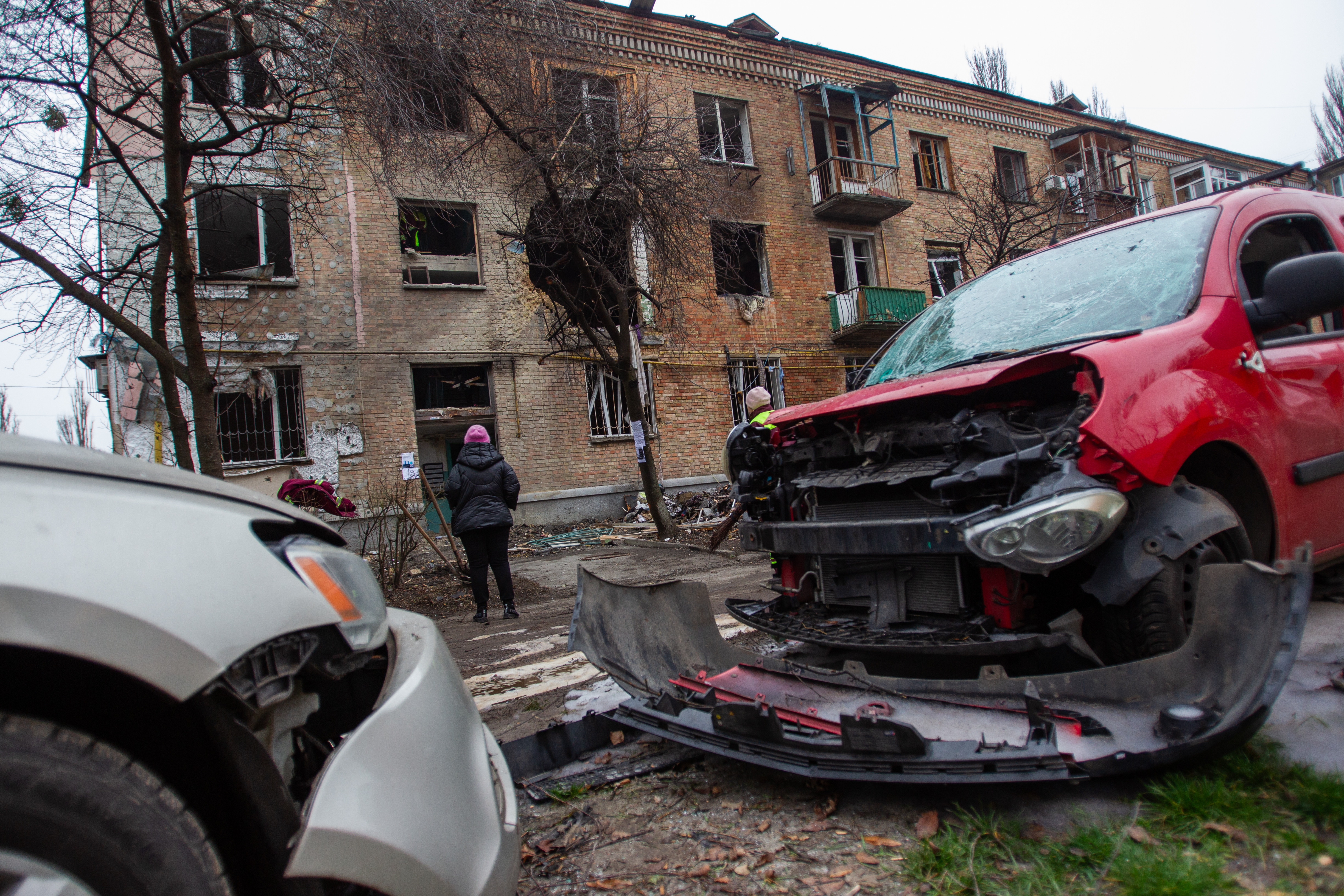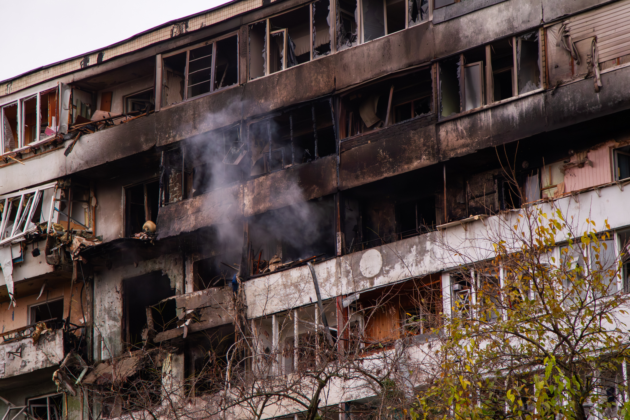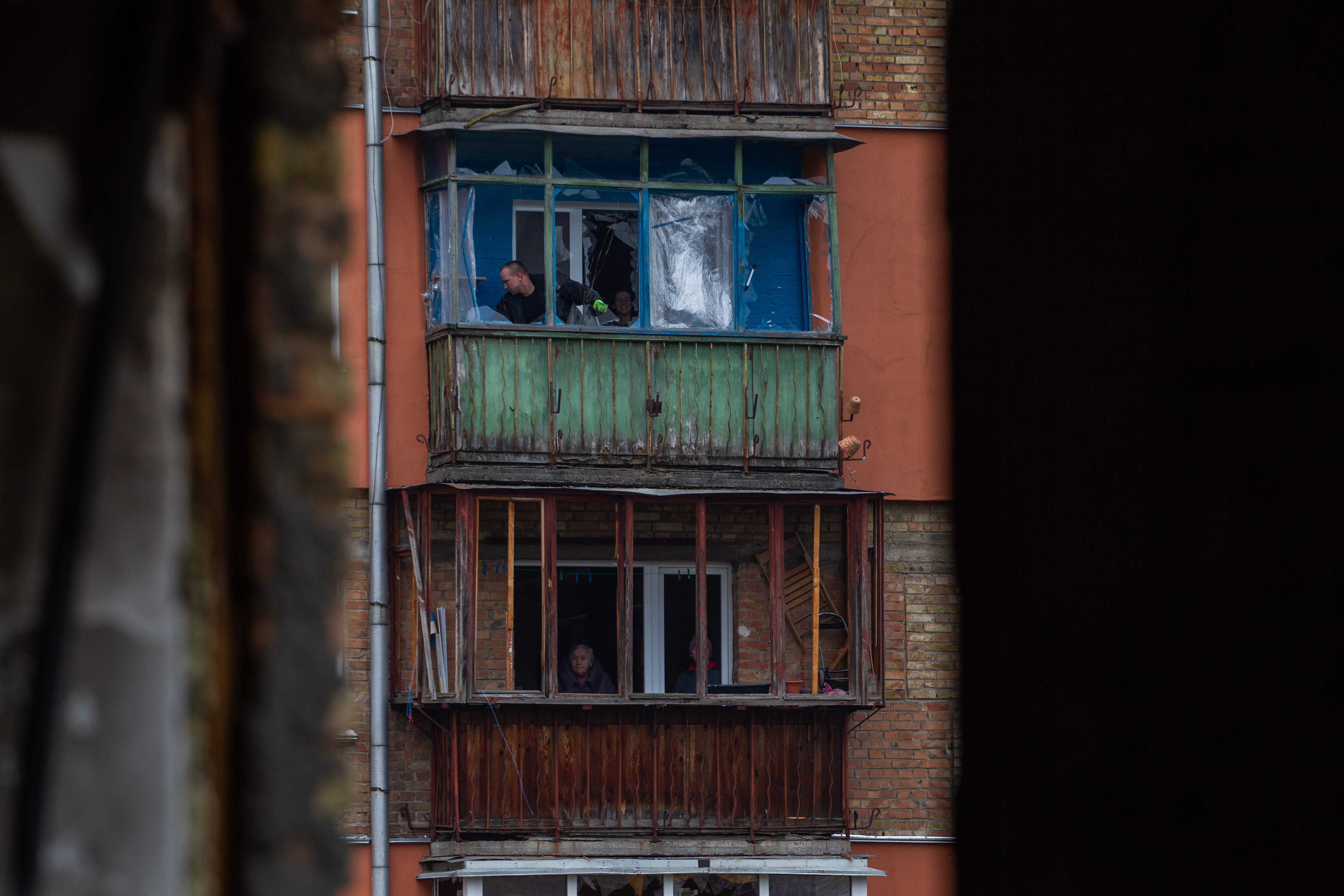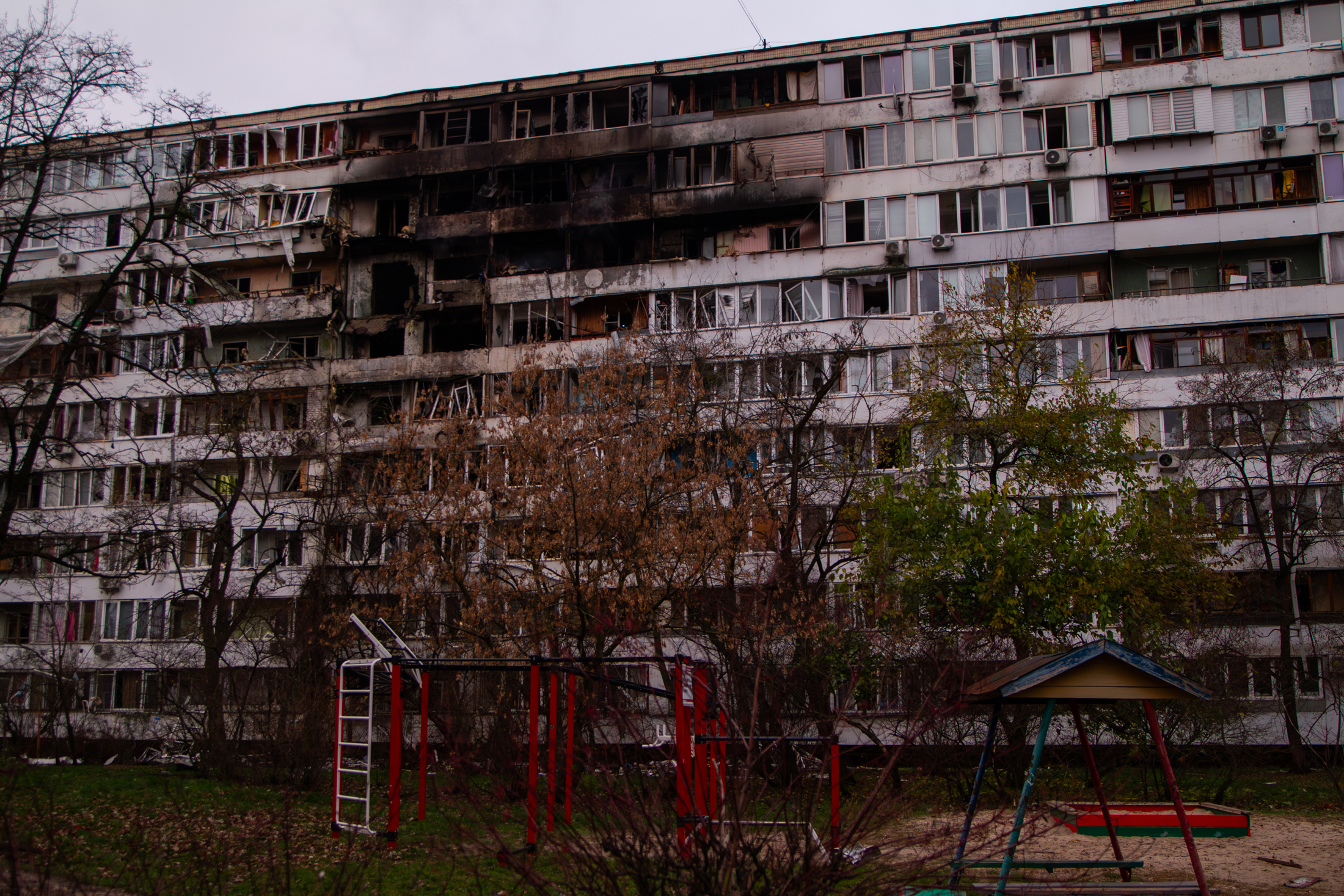 Damage is seen to an apartment building in Kyiv’s Sviatoshynskyi district hit by shelling, November 29, 2025