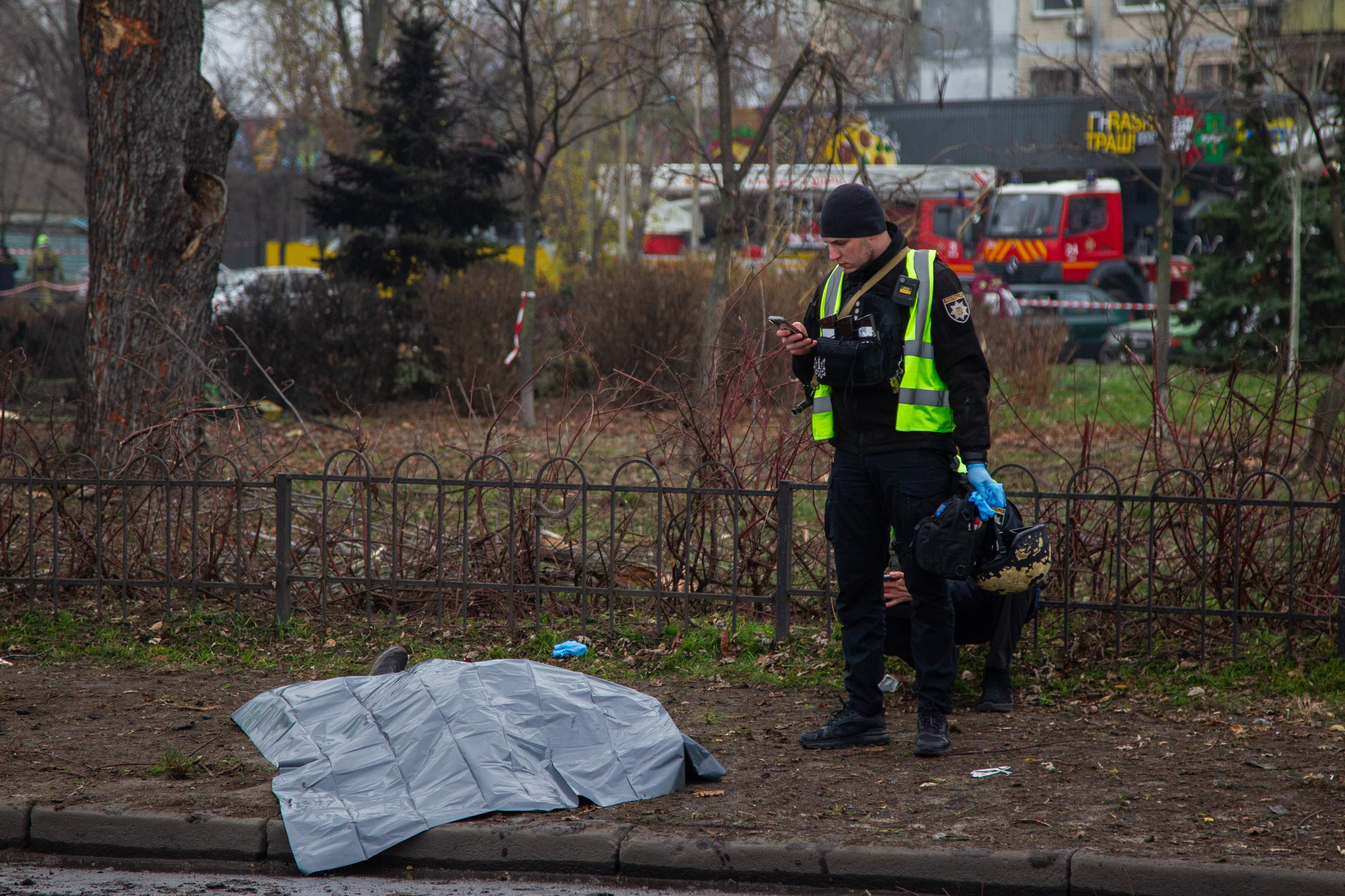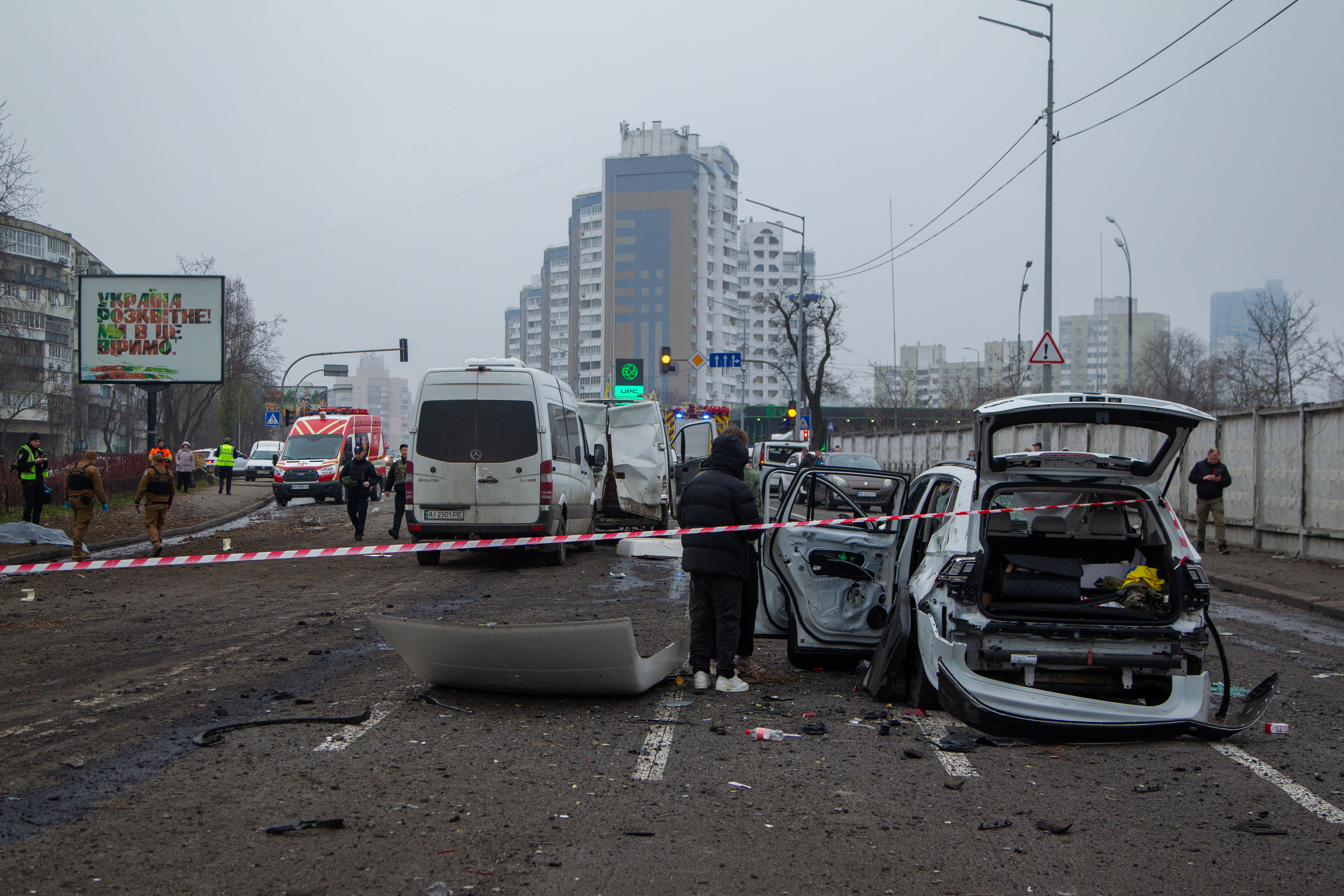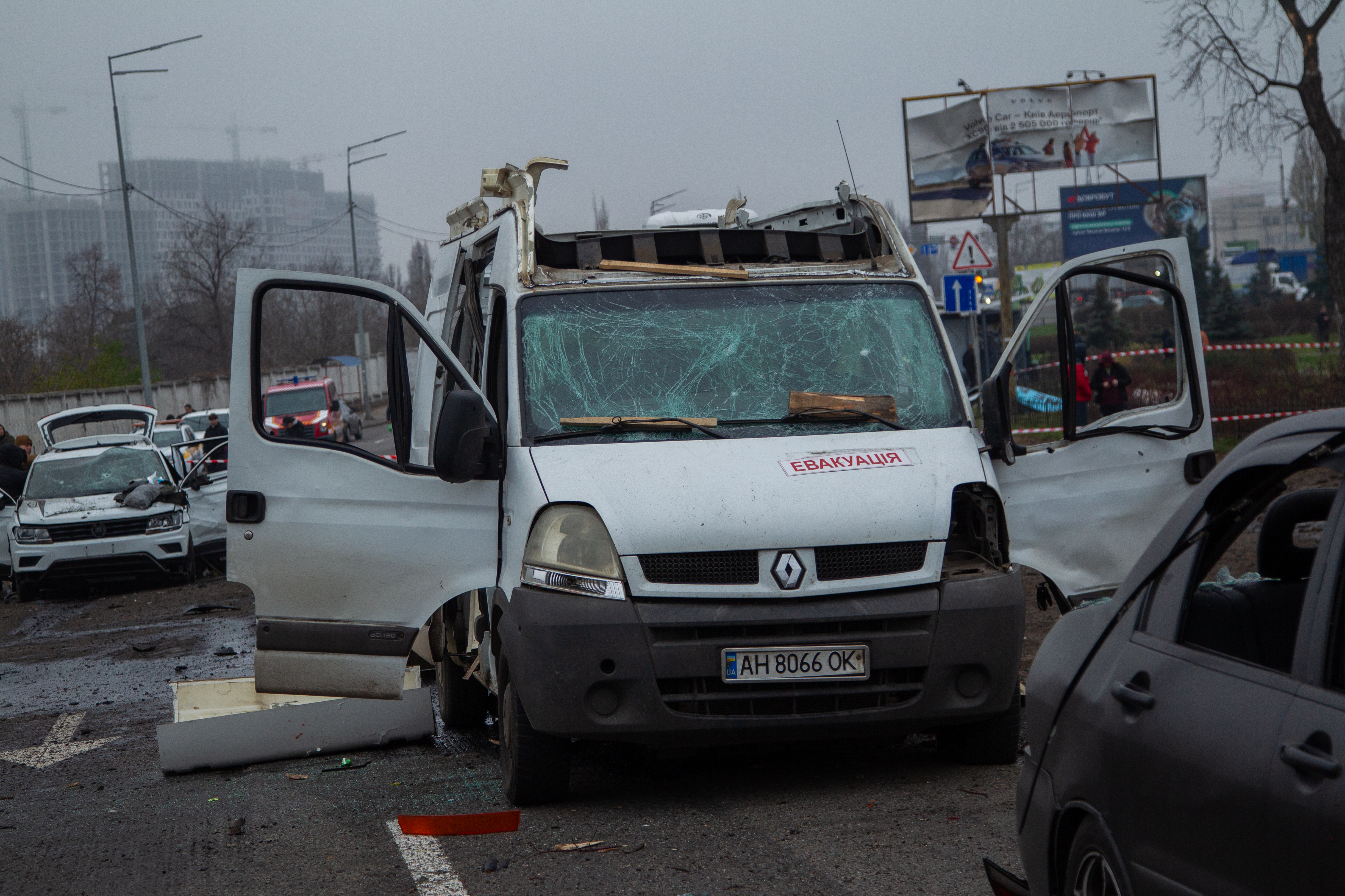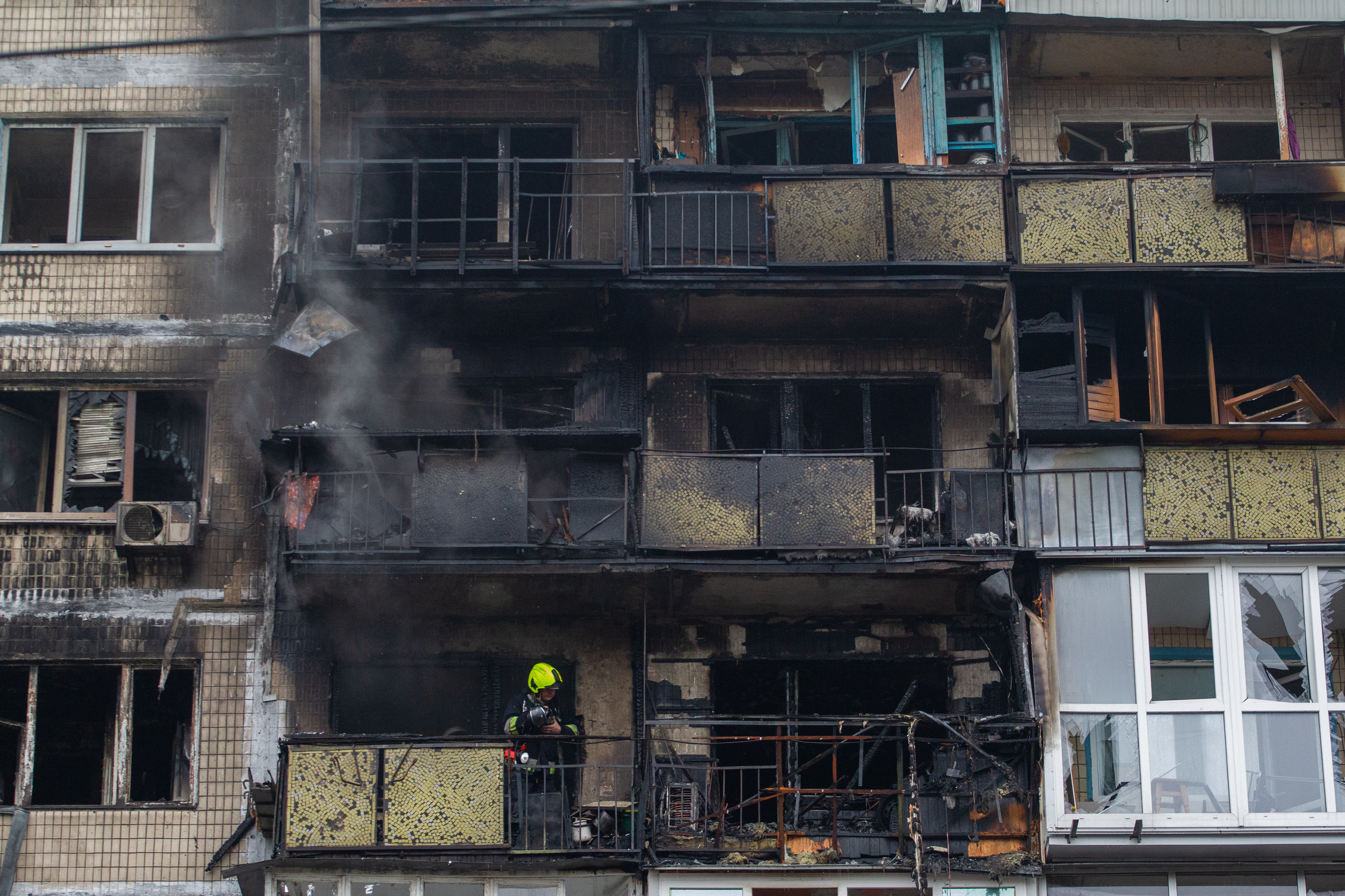 Damage is seen to an apartment building in Kyiv’s Sviatoshynskyi district hit by shelling, November 29, 2025