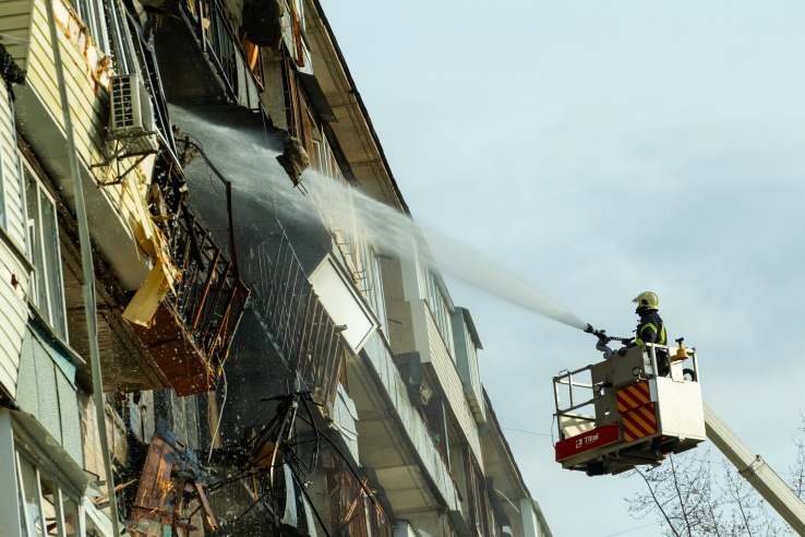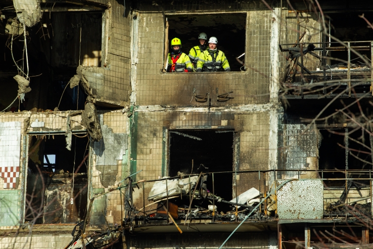 Rescuers operate inside a multi-story apartment building severely damaged by a russian strike, Kyiv, July 4, 2025